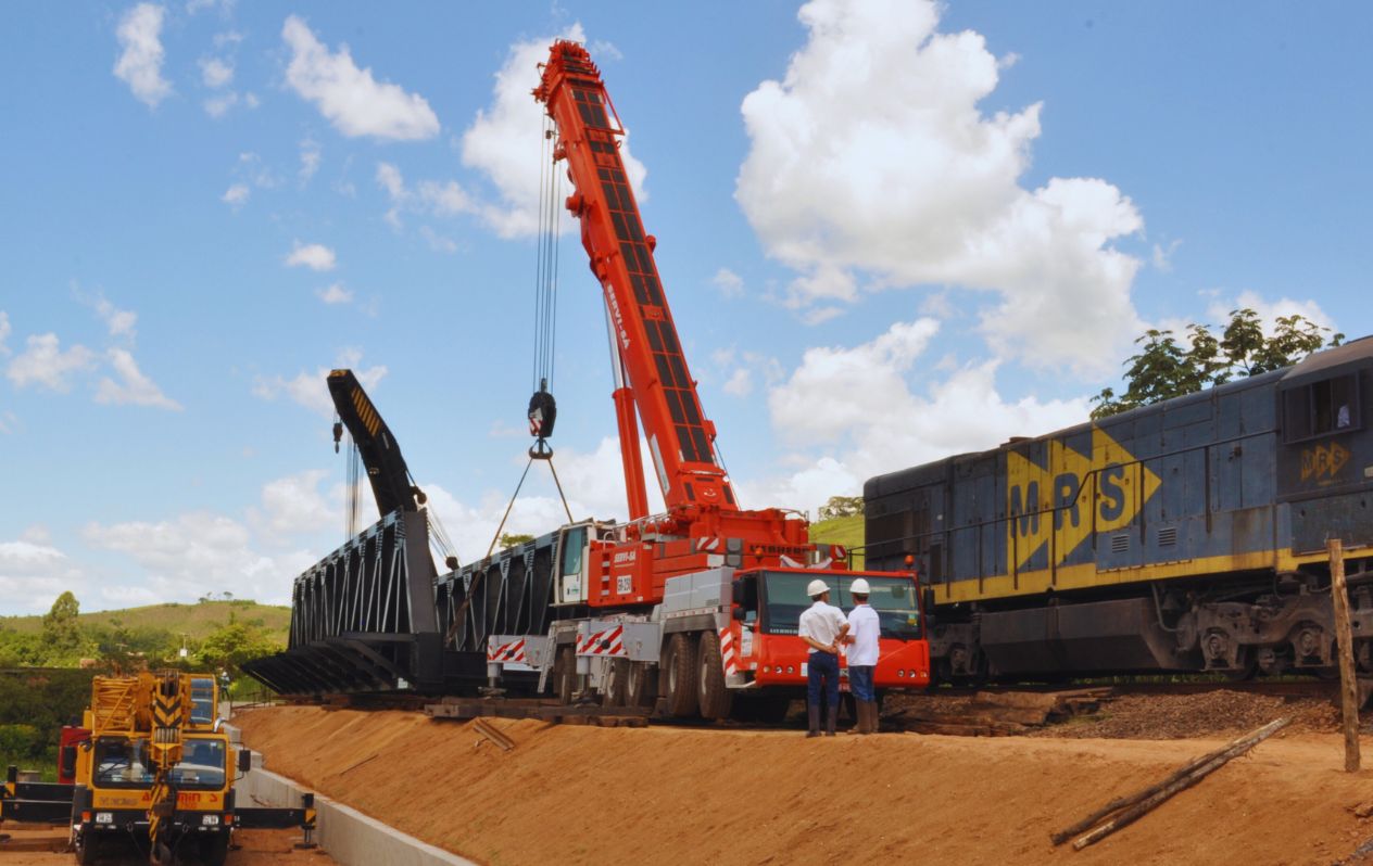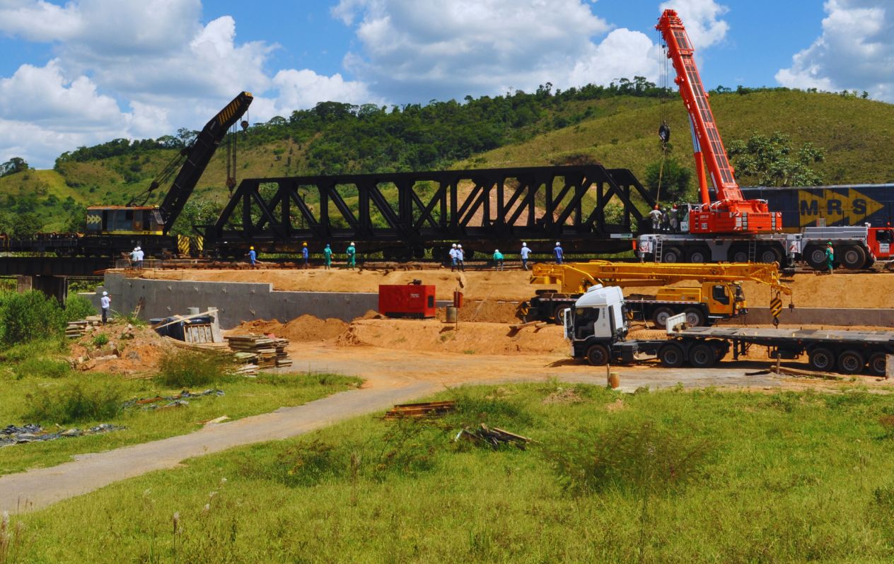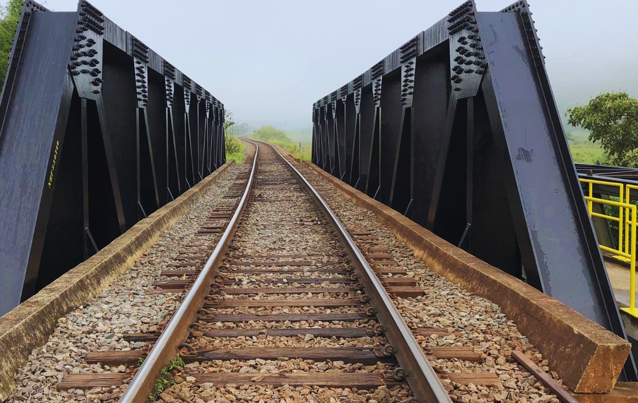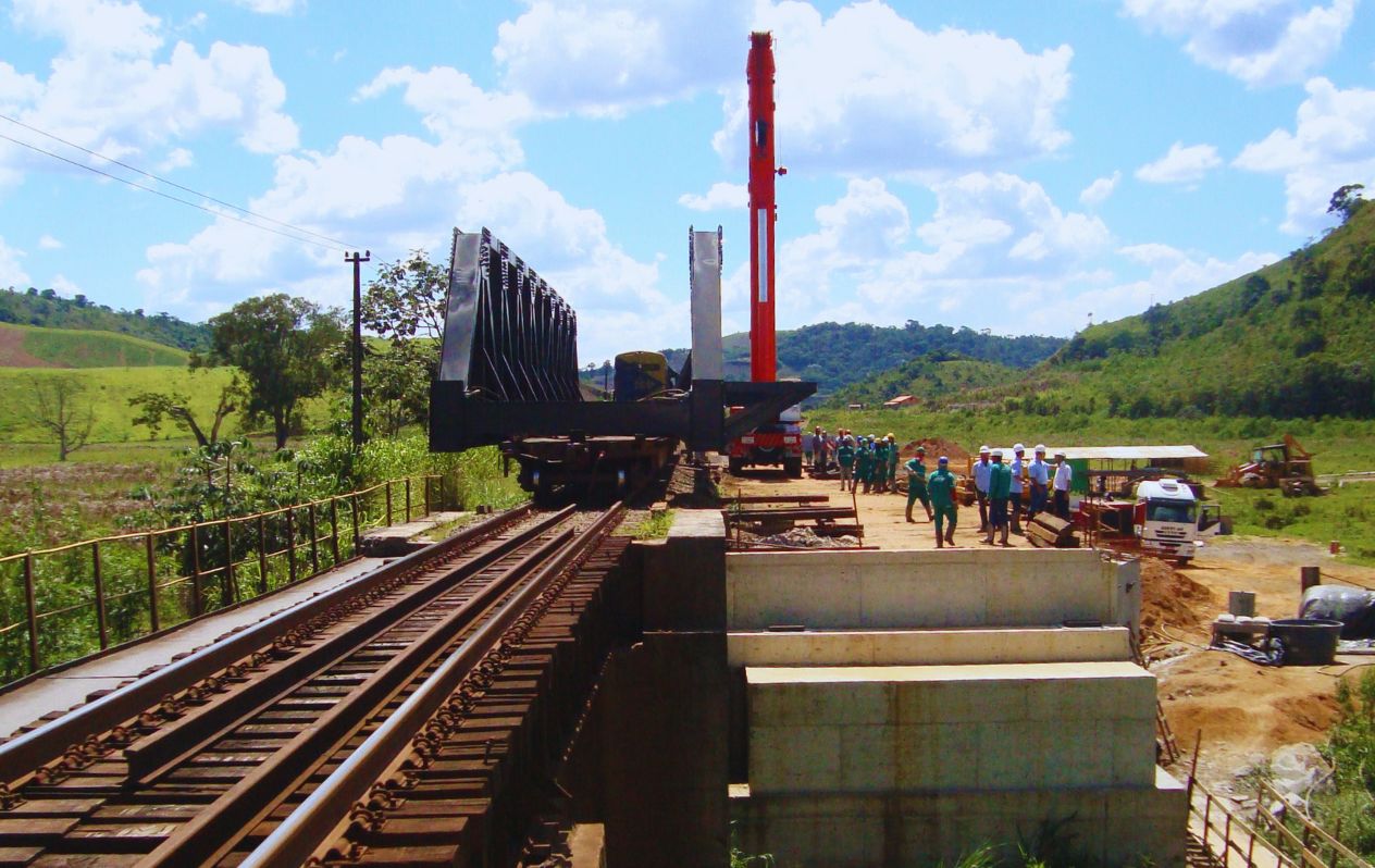Construção de ponte ferroviária e passarela de pedestre em estrutura mista e obras de contenção em cortina atirantada e muro de concreto armado.