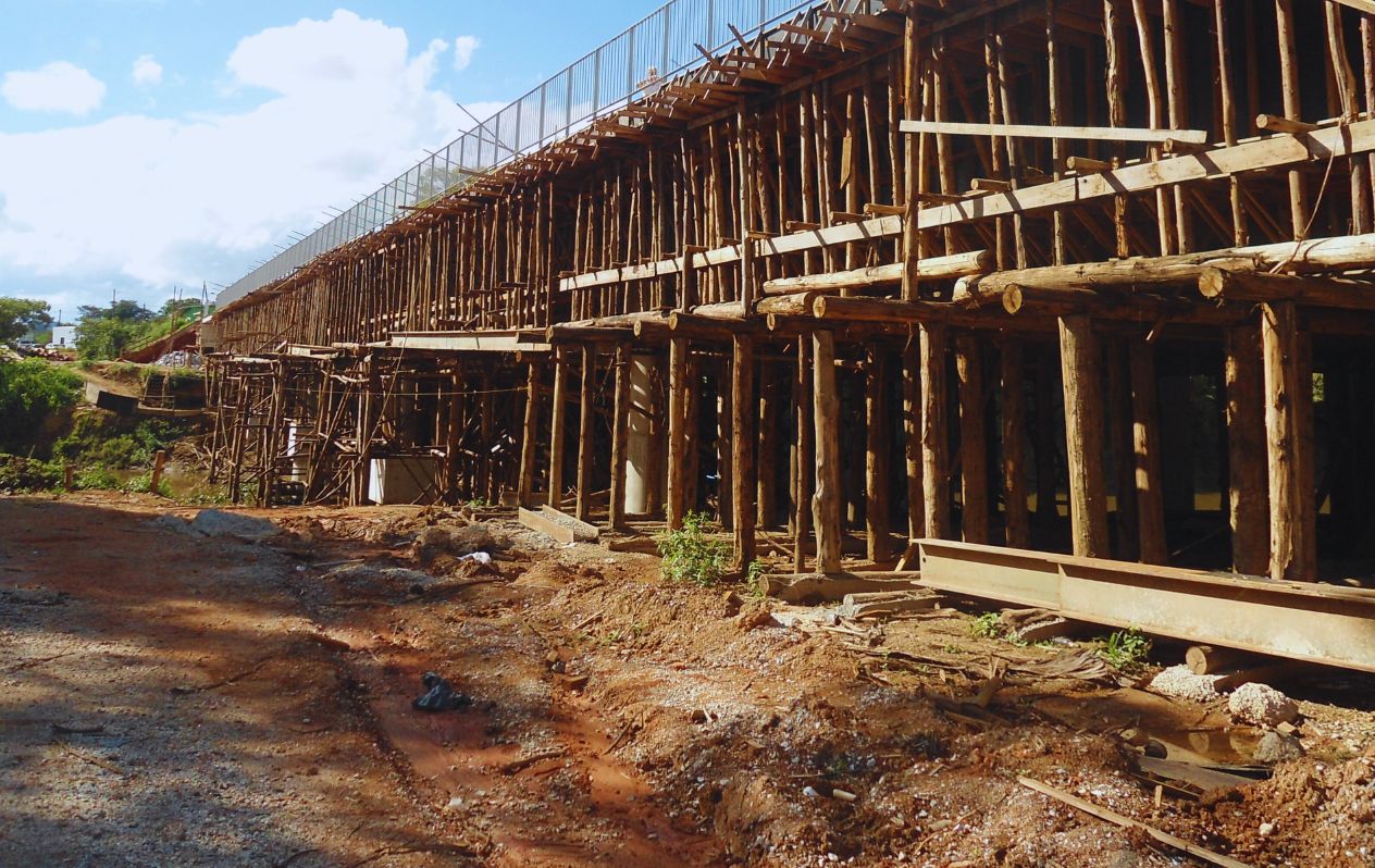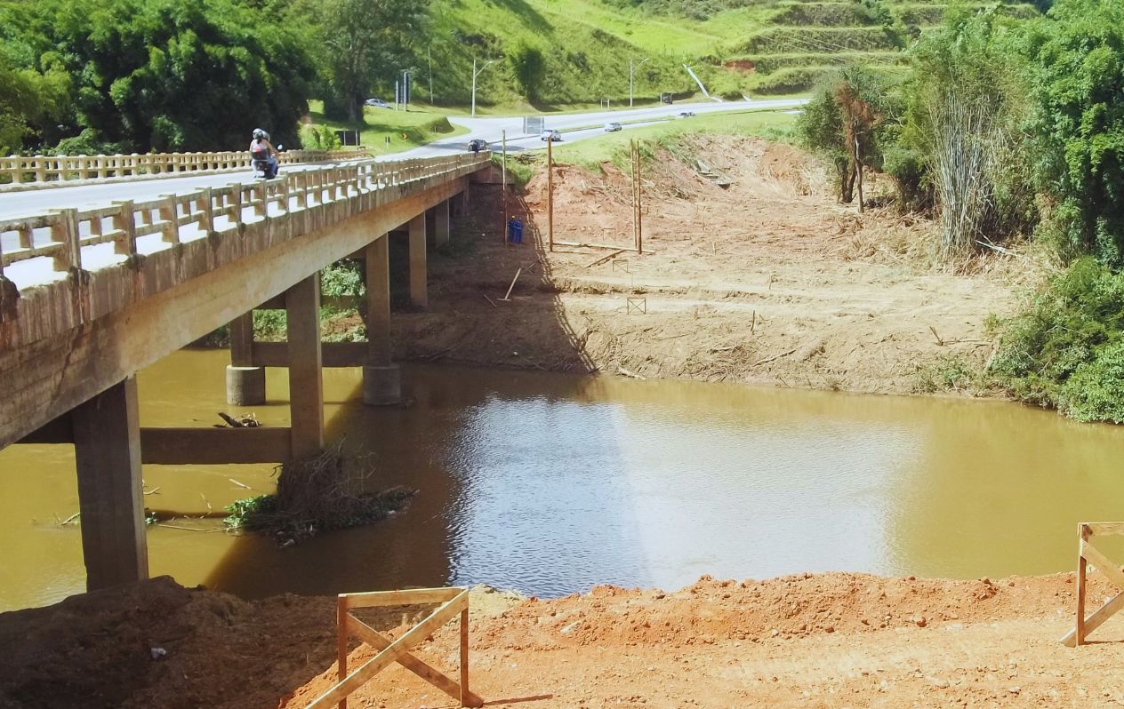 Demolição de ponte rodoviária antiga em concreto armado e construção de nova ponte também em concreto armado